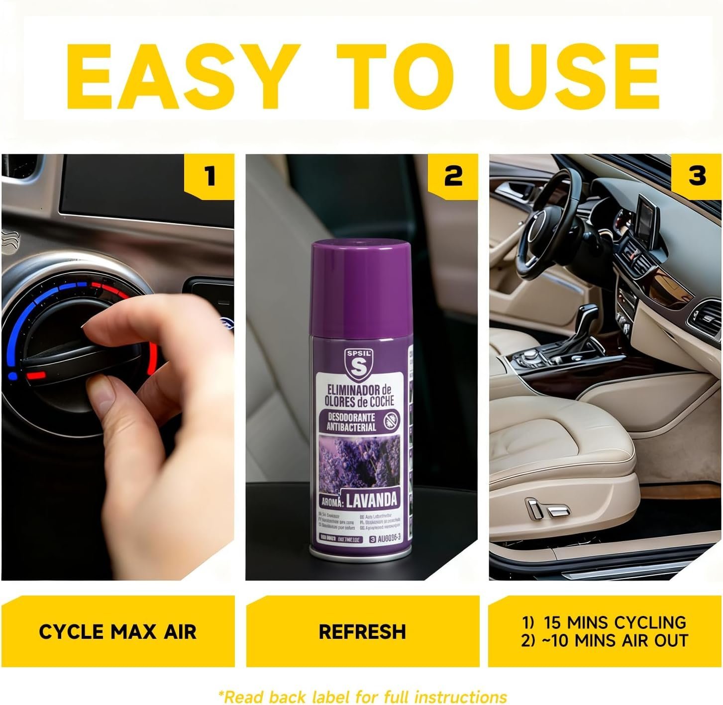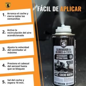 Fórmula Antibacteriana: Actúa eliminando los gérmenes y bacterias que causan olores, proporcionando un aire más limpio y saludable. Fácil Aplicación: Con un diseño intuitivo, solo necesitas seguir unos sencillos pasos para activar y disfrutar de su efecto inmediato. Versatilidad de Uso: Adecuado para todo tipo de vehículos, incluyendo coches, SUV, camionetas y vehículos comerciales, ideal para cualquier amante de la conducción. Arranca el coche y asegúrate de cerrar todas las ventanas. Activa la recirculación del aire acondicionado para maximizar la difusión del producto. Ajusta la velocidad del ventilador al máximo para una dispersión óptima. Presiona el cabezal del aerosol hasta que se bloquee, permitiendo que comience a pulverizar. Sal del vehículo rápidamente y cierra las puertas para concentrar el efecto del producto en el interior.